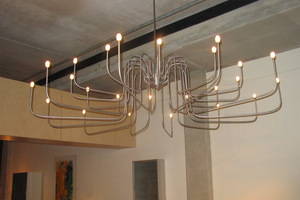 Kroonluchter model Huerta hebben we bij een aantal projecten toegepast in verschillende op maat gemaakte uitvoeringen. Het grootste model hebben we gerealiseerd in Sauna Houten en heeft 36 messing armen en een diameter van 360 cm. Voor muzeum de Koperen Knop hebben we een aangepast model uit rvs gemaakt met in totaal 20 armen. Ook is het mogelijk veel kleinere modellen te maken voor lagere ruimtes, deze kunnen we op maat leveren in verschillende materialen.